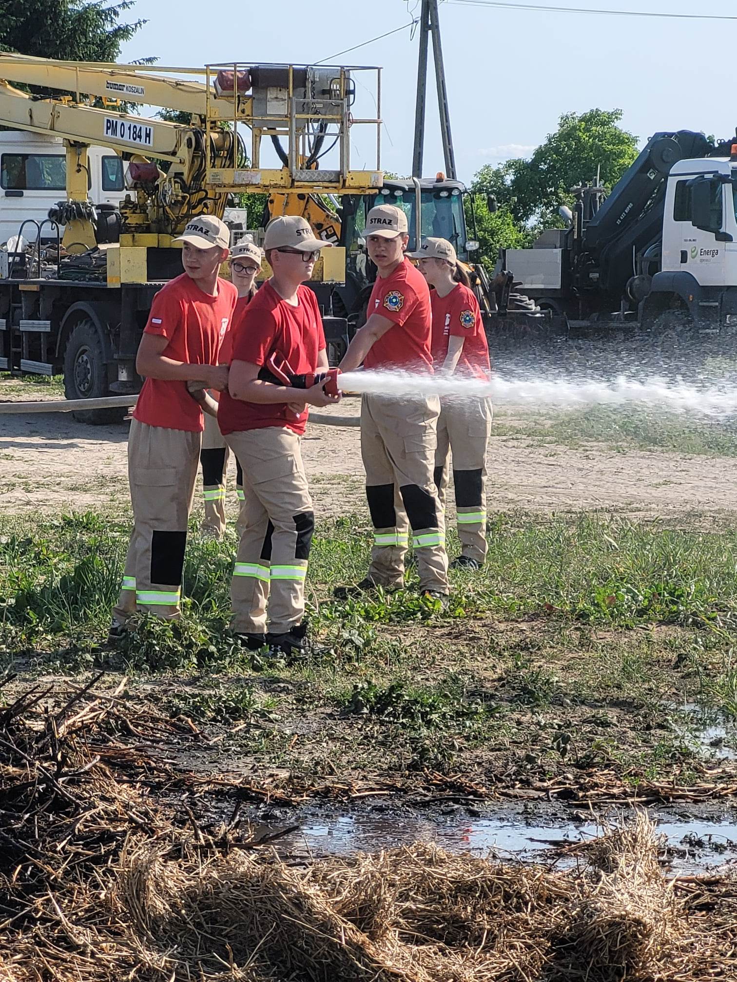 Nasi „Młodociani” nauczyli się podczas ćwiczeń jak ułożyć linię, jak szybko i profesjonalnie rozwijać i łączyć ze sobą węże oraz jak obsługiwać prądownicę i rozdzielniki podczas gaszenia pożaru.